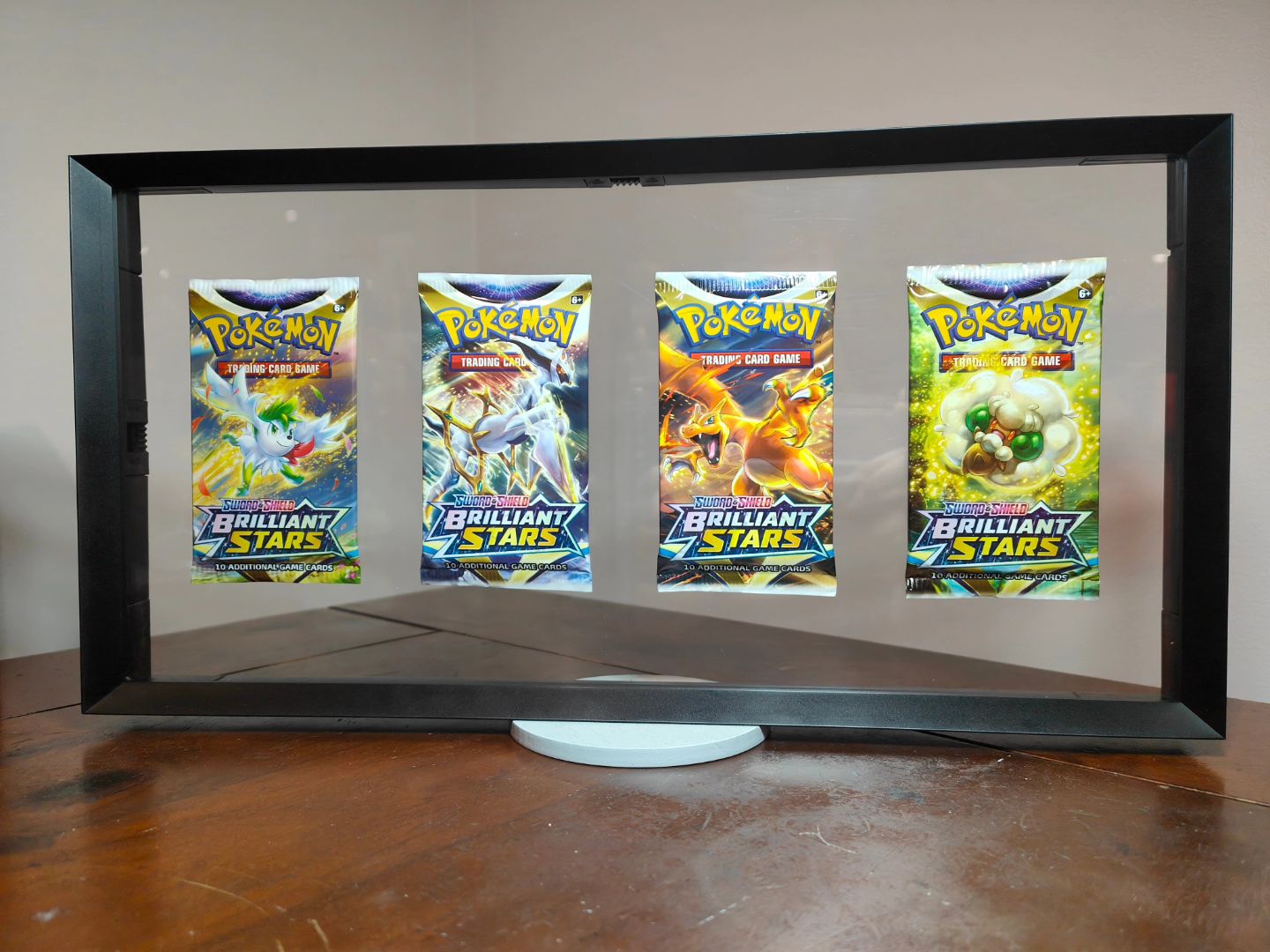 Showcase your love for Pokémon with this exclusive, hand-crafted Pokémon pack display, expertly displayed in a sleek floating frame. Each pack is sealed, carefully chosen for its rarity and pristine condition, making it a perfect collector's item. Suspended within the frame, the pack appears to "float," creating a dynamic 3D effect that brings the artwork and packaging to life.